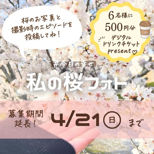投稿してくれた方の中から抽選で6名様にデジタルドリンクチケット500円分をプレゼント!今年の春を感じながら「美味しいドリンクでホッと一息」のご褒美タイムをぜひどうぞ。
