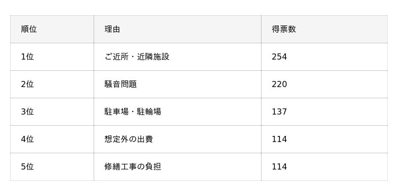 マンション購入で後悔した理由の第1位は「ご近所・周辺環境」でした。