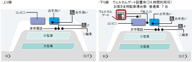 また、下り線には高速道路をご利用のお客さまに加え、地域の皆様にもご利用いただけるよう、ウェルカムゲートを設置いたしました。皆様のお越しをお待ちしております。