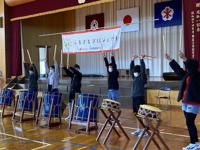 今回は、太陽光発電事業に取り組む当社グループ会社であるソーラーフロンティア株式会社が拠点をもつ宮崎県東諸群国富町の本庄小学校で開催し、6年生64名が参加しました。和太鼓の演奏体験では、初めは戸惑っていた児童も次第に体全体を使って和太鼓を叩き、大きな音を出して楽しんでいました。また、演奏鑑賞・演奏体験終了後に児童たちがお礼として「ふるさと」の合唱を披露してくれました。