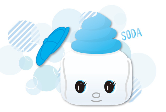 ここでしかお召し上がりいただけないスケルトン容器の「ラムネ味」をはじめ、ストロベリーなど4種の味をご用意。自分でくるくる入れるのも楽しい!