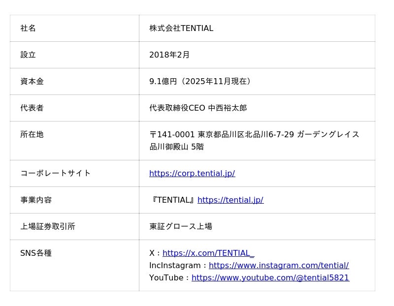 コンディショニングブランド『TENTIAL』は、アスリートの知見と最新技術・研究に基づき、機能性を追求した製品・サービスを提供。24時間365日、日常生活のあらゆるシーンで心身を整え、疲労回復やパフォーマンス向上をサポートするコンディショニング活動を推進しています 。すべては個人のコンディションとポテンシャルを引き出すという信念のもと、株式会社TENTIALは、健康に前向きな社会の実現のため、コンディショニングの社会実装に取り組んでまいります。
