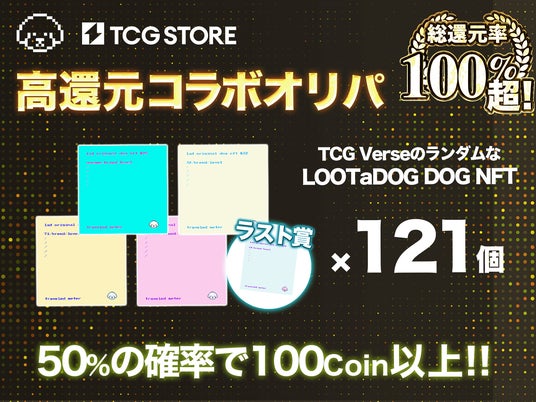 トレカRWAプラットフォーム「TCG STORE」にて、株式会社PetFileが開発を行う愛犬のお散歩アプリ「LOOTaDOG」とコラボし、 LOOTaDOGコラボNFTオリパの提供を開始いたします。TCG STOREでは、今後も定期的にコラボオリパを追加して参ります。