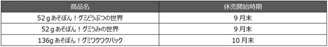 「あそぼん!グミ」は、「お菓子な、おもちゃ。」をコンセプトに、見て、触って、噛んで、おしゃべりしたくなる、子どもはもちろん、親も嬉しいグミです。発売以降、豊富なグミの形など遊び心くすぐる仕掛けをご好評いただいておりましたが、より親子で楽しんでいただくために、商品のバージョンアップを行うこととなりました。これまでに「あそぼん!グミ」に寄せられたお客さまの声なども参考にし、ブランドコンセプトを見直す期間をいただくために下記商品を休売させていただきます。