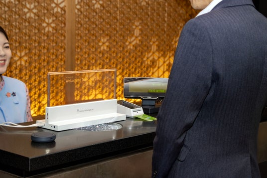 3. カウンタースタッフが日本語で話した内容も同様に、お客さまの選択した言語でリアル タイムに翻訳されて透明ディスプレイに表示される。