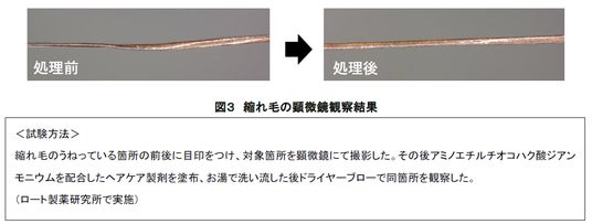 アミノエチルチオコハク酸ジアンモニウムを配合したヘアケア製剤を作製し、縮れ毛へ塗布、ドライヤーブローを行ったところ、同箇所のうねり改善が見られました(図3)。