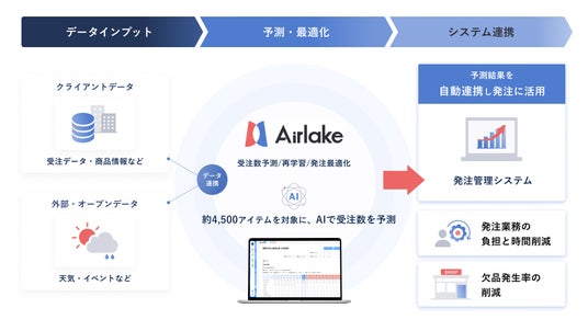 伊藤忠食品が保有する過去の出荷実績や各種マスタデータに加え、DATAFLUCTのデータ活用プラットフォーム「Airlake」を通じて取得する気象情報やイベント情報などの外部データを活用し、倉庫別・商品別・日別に受注数をAIで予測します。今後、この予測結果に対し、欠品リスクを考慮した安全在庫計算やメーカーごとのリードタイム、最低発注ロットといった物流制約を自動で適用する発注ロジックを伊藤忠食品にて構築し、現場担当者の判断を高度に再現した「推奨発注数」を提示する仕組みの実現を目指します。