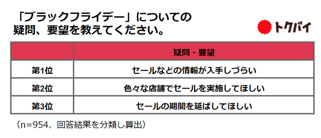 「ブラックフライデー」に関する疑問・要望は「セールなどの情報が入手しづらい」「もっと色々な店舗で実施して欲しい」の声