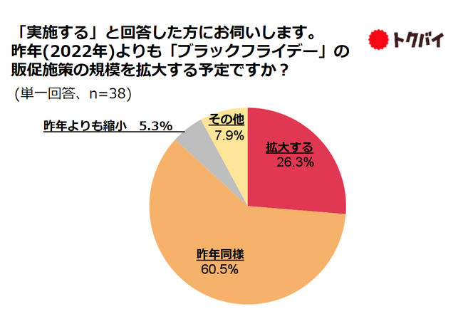 「トクバイ」の導入企業109社に今年(2023年)の「ブラックフライデー」期間において、セールやイベントなどの販促施策を実施する予定があるかたずねたところ、「実施する。(施策の)詳細も決まっている」との回答が26.6%に上り、昨年(2022年)と比較して約1割増加しました。また、販促施策を「実施する」と回答した企業に、昨年よりも規模を拡大する予定か聞いたところ、「拡大する」26.3%、「昨年同様」60.5%と、合わせて8割以上の企業が昨年と同等かそれ以上の規模のセールやイベントを計画していることが分かりました。