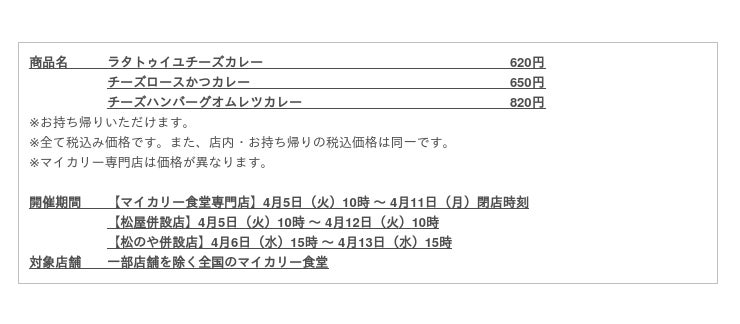 お好みでトッピングをプラスワンして『自分だけの“マイカリー”』を楽しんでもらう…そんなコンセプトから2013年に誕生したカレー専門店「マイカリー食堂」が皆さんの新生活を応援して「新生活増量フェア」を開催いたします。第1弾はとろ~りチーズ50%増量!マイカリー食堂のどのカレーとも相性抜群のチーズがいつもの1.5倍に。にんにくとオリーブオイルで炒め、旨みをギュッと詰め込んだ南欧風の野菜たっぷりトマト煮込みにカレースパイスが加わった「ラタトゥイユチーズカレー」、自慢の手仕込みロースかつがたまらない「チーズロースかつカレー」、ハンバーグのジューシーさでコクが増す「チーズハンバーグオムレツカレー」がチーズ増量対象商品です。とろ~りチーズでまろやかな味わいのカレーをぜひお楽しみください。