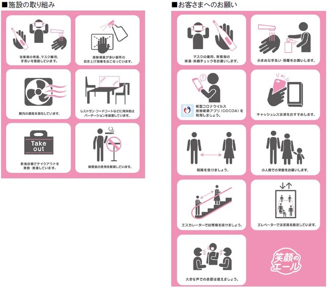 三井不動産グループが運営する商業施設では、新型コロナウイルス感染拡大防止のため、下記をはじめとしたさまざまな取り組みを実施しております。
