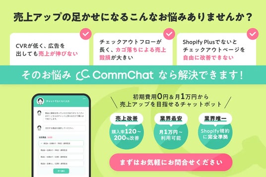 「CommChat」なら、商品の購入フローが1ページにまとまり、チャット形式に回答するだけで決済までワンステップで完了。エンジニア不要のかんたん設定で、最短1日でチャットボットを導入可能です。業界最安値の初期費用0円・月1万円から利用でき、CVR向上と売上UPが期待できます。