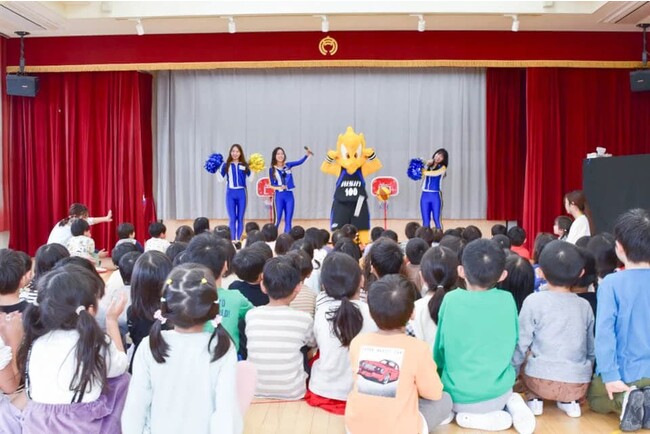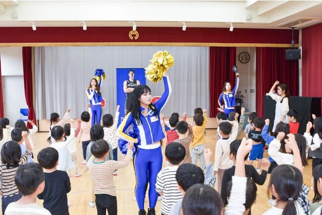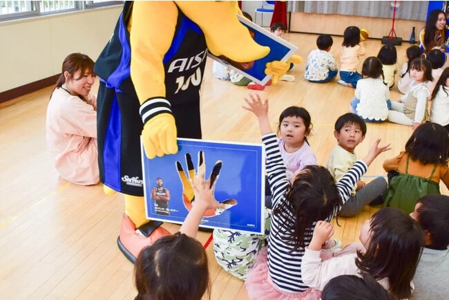 2023年11月6日(月)、シーホースくんとSuper GirlsのHIBIYU、 SAHO、YUKIが作野保育園(安城市)を訪問し、園児の皆さんと一緒にクイズやダンスを楽しみました。