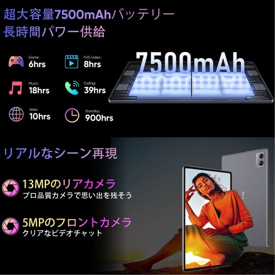 【7500mAhバッテリー・5G WiFi・Bluetooth5.0】長時間利用可能な大容量バッテリー。高速デュアルバンドWiFi、Bluetooth5.0対応。GPS搭載で正確な位置情報取得。