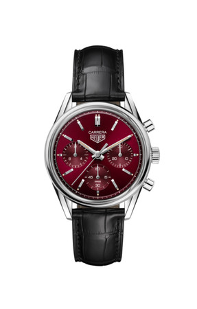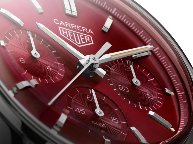 今回のディープレッドのモデルは、クラシックなタイムピースに新たなエネルギーを与え、その存在感を示しています。ダイヤルはサンレイ仕上げで、3つのクロノグラフカウンター(時、分、秒)はスネイル仕上げとなっており、腕元に絶妙なコントラストと魅惑的で美しい光の陰影をもたらします。ダイヤルには、ホイヤー ロゴとカレラの名称が配されています。