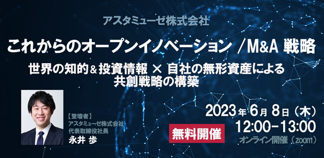 アスタミューゼ株式会社(本社:東京都千代田区、代表取締役社長 永井歩)は、2023年6月8日(木)12:00~13:00に、業界を問わず、提携/M&A/CVC等のオープンイノベーションを推進されている方、サステナブルな事業戦略を検討されている事業企画の方を対象とした無料ウェビナー「これからのオープンイノベーション / M&A戦略 ~世界の知的&投資情報×自社の無形資産による共創戦略の構築~」を開催いたします。2023年5月に実施した同タイトルのウェビナーが大変好評だったため、再度の開催となります。