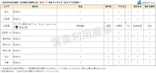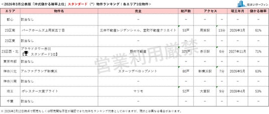 昨今のマンション価格の高騰を受け、購入検討時に資産性を重視する消費者の割合が高まりつつあります。このような社会動向と消費者ニーズをふまえ、「住まいサーフィン」では資産性を重視したマンション選びの支援を目的に、首都圏のマンションを「沖式儲かる確率」の高い順にランキング化し、毎月発表しています。対象物件は、首都圏で販売中および販売予定のマンションで、本リリースでは9エリアにおける“スタンダード(*)”物件と“家活(*)”物件それぞれ1位の物件のみを公表しています。