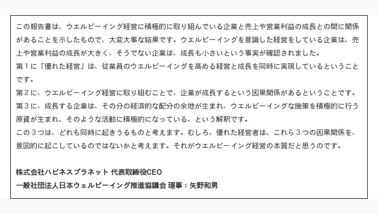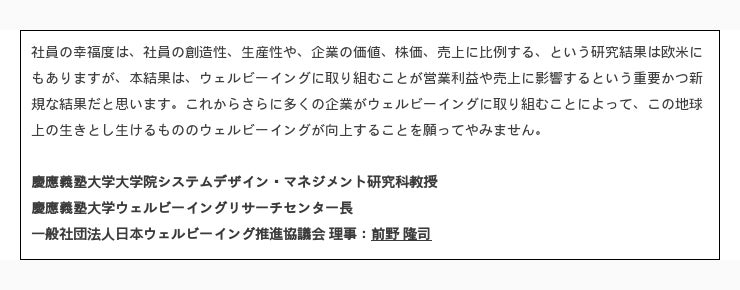 また、この調査結果は、「ウェルビーイング活動と企業業績に関する実態調査」(以下、本調査)として、本日より公開を開始し、幅広い業界の企業・団体に対するウェルビーイングを普及啓発してまいります。