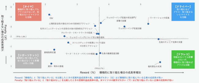 本調査により、積極的に取り組むほど営業利益、売上高ともに効果が出るウェルビーイング活動として「ワーケーション」の貢献度が高いことがわかりました。ワーケーションは積極的に取り組むほど業績相関度が高く、取り組まない場合の業績相関度はマイナスになる“ドライバー”活動であることがわかりました。