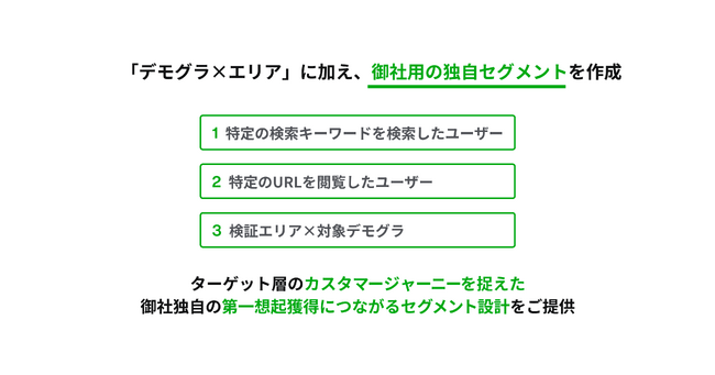 YouTubeに用意されているセグメント設定に加え、各企業のサービスに沿った独自のセグメントを作成します。特定の検索キーワードやURL閲覧などユーザー行動を捉ることで、より深いターゲティングが可能です。