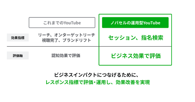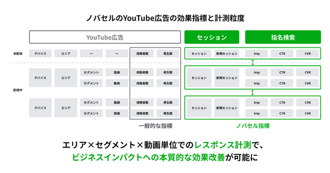YouTube広告における効果の可視化や成果計測、運用改善の課題は、テレビCMと同課題です。ノバセルのこれまでの運用型テレビCMの知見を活かすことで、これまでリーチ指標がメインであったYouTube広告をレスポンス計測を元にビジネスインパクトにつながる効果改善を行うことができると考えサービスの提供を開始するにいたりました。