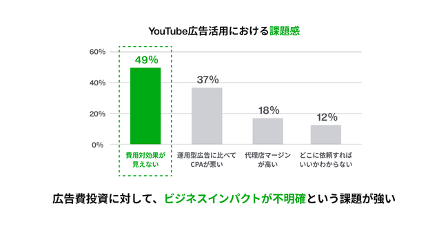 しかし市場が拡大する一方で、ノバセルが実施した2023年6月のYouTube利用実態調査では、YouTube広告利用企業において約半数の49%が、課題は「費用対効果がわからないこと」と回答しており(⋆1)、動画広告の効果やビジネスインパクトが不明瞭であると捉えられています。