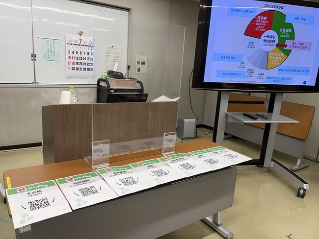 当日は事前に応募のあったお子さんと保護者の方に向け、お金やキャッシュレス、国の予算などについてクイズ形式を交えてお話した後、「せたがやPay」のデモアプリを使ったキャッシュレス決済体験企画を実施しました。キャッシュレス決済体験企画では、「未来の日本がもっと良くなるために1,000円を何に使うと良いか考えよう」をテーマに、「社会保障」「公共事業」「国債」など国の予算を模した支払先QRを用意し、参加したお子さんたちが一人ひとり、総理大臣になったつもりで予算配分を決め支払い体験をしました。