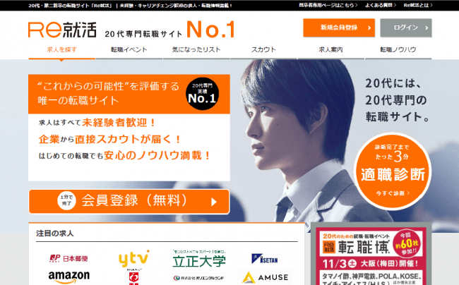 「Re就活」は多くの若者から支持を受け、2016年に「転職情報サイトの20代会員比率 第1位(実査委託先:楽天リサーチ)」を獲得しました。2017年には「スカウトメール」や業界初のWeb面接機能「スマ面」などを導入するなどフルリニューアルを行い、 2018年には神木隆之介さんを起用したテレビCMを始めとする大型プロモーションで注目を集めました。 今では「Re就活」の登録会員数は100万名を突破しております。