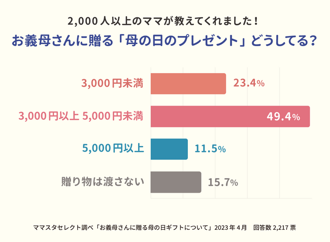 毎年5月の第2日曜日は “母の日”です。実母へのプレゼントではなく義母へのプレゼントに頭を悩ます人も多いそうで、なかでも気になるのがその予算・価格のよう。そこで今回ママスタセレクトでは、「お義母さんに贈る“母の日のプレゼント”予算はどのくらい?」と題したアンケートを実施しました。回答に設定したのは「3,000円未満」「3,000円以上5,000円未満」「5,000円以上」「贈り物はしない」の4つです。