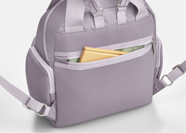 リュック前面にある大きなフロントポケット内には、小物の収納に便利なオープンポケットや可動式底板が付いており、底板を倒すとお弁当箱のような幅のある荷物を安定して収納できます。また、新たにフロントポケット内装に抗ウイルス・抗菌加工生地を採用しました。お食事の際に外したマスクの収納にも適しています。