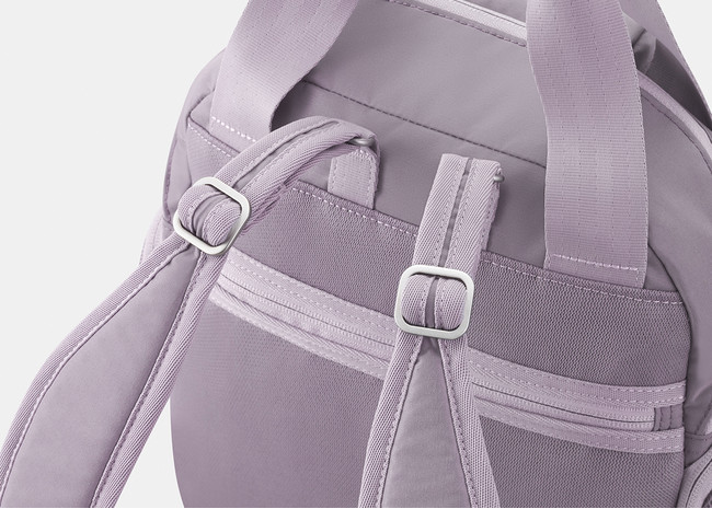 背負った際にしっかりフィットしてズレ落ちにくいよう、リュックの肩ベルトは身体に沿うカーブ形状になっています。体型に合わせてクッションパッドの位置を細かく調整できるよう、長さ調節金具を上下2箇所に配置しました。