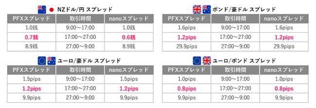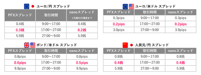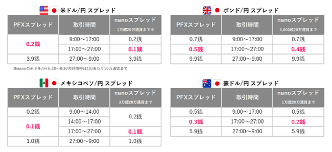 概要:17時~27時の時間帯(ゴールデンマネパタイム)は、『パートナーズFX』・『パートナーズFXnano』の全16通貨ペアを業界最狭水準スプレッドでお取引いただけるキャンペーンを実施いたしております。原則固定(例外あり)
