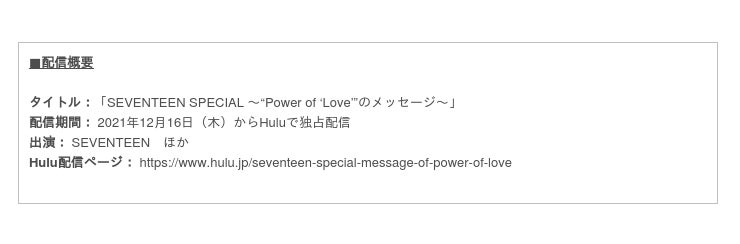 「SEVENTEEN SPECIAL ~“Power of ‘Love’”のメッセージ~」2021年12月16日(木)からHuluで独占配信