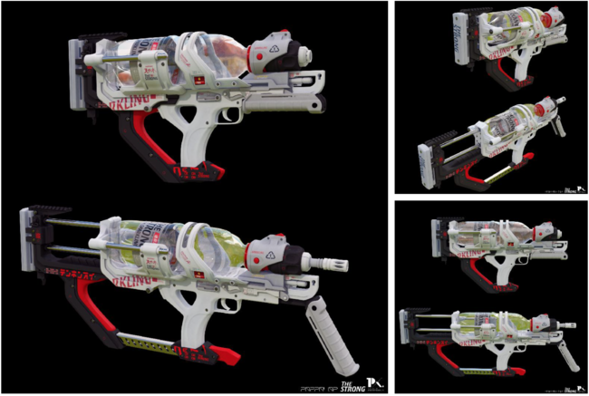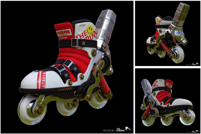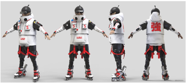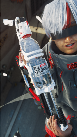 ARuFa氏が「強渋谷」で装着するアイテムデザインは、millennium parade MVや「今際の国のアリス」でメカデザインを手がけた3DCGメカデザイナー・帆足タケヒコが担当。どちらも「ザ・ストロング」をベースにしたカラーリングや形状を意識している。激泡シューターは、その泡を口にした者の心をリフレッシュする機能を持ち、激泡スケートは、強炭酸の圧力を動力としてスピードを最大化する機能を搭載している。