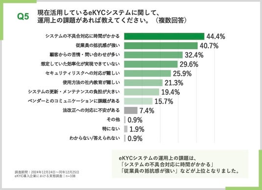 「現在活用しているeKYCシステムの運用上の課題」として最も回答が多かったのは「システムの不具合対応に時間がかかる」(44.4%)でした。また「従業員の抵抗感が強い」「顧客からの苦情・問い合わせが多い」という回答も3割前後となり、スムーズなシステム導入には適切なオペレーションが必要なことが分かりました。