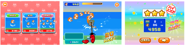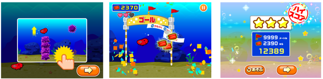 「めんたいこだいすき!」は、キャラクターをタップで操作してゴールを目指す「およげ!タラピヨ」と、網を上手に操作してスケソウダラを捕まえる「スケソウダラゲット」の2つのゲームで構成されています。