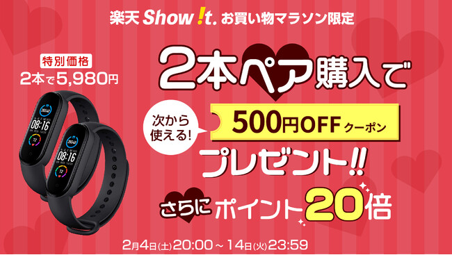 楽天市場「Show !t」は2月4日(土)20時からシャオミのMiバンド5を2本ペア5,980円(税込)ご購入の方に500円クーポンとポイント20倍プレゼントを実施します。また、キャンペーン期間は、2月4日(土)20:00~2月14日(火)23:59までに延長します。この機会にシャオミのスマートバンドでポイントをザクザク貯めましょう。