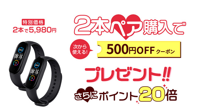 xiaomi(シャオミ)Miバンド5ペアで購入すると、500円クーポンとポイント20倍プレゼント 2本ペアで5,980円(税込)