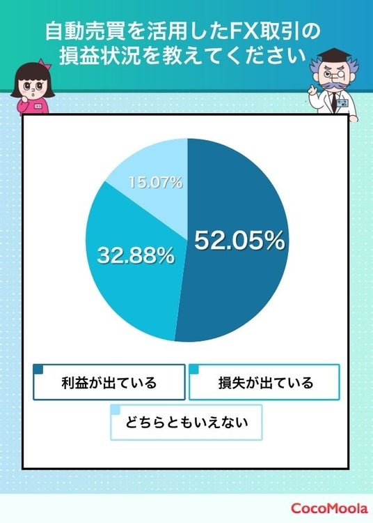 - 自動売買の損益状況では「利益が出ている」と回答した人が52%と過半数を占め、成果に対する一定の手ごたえが見られた。