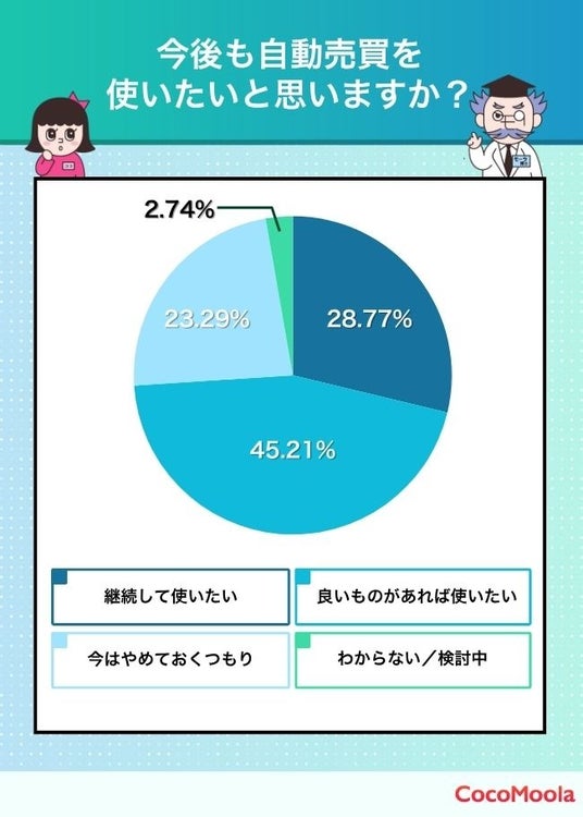 - 今後の利用意向では「継続して使いたい」29%、「良いものがあれば使いたい」45%と、今後の自動売買ツールの進化に期待を寄せる声が多く見られた。