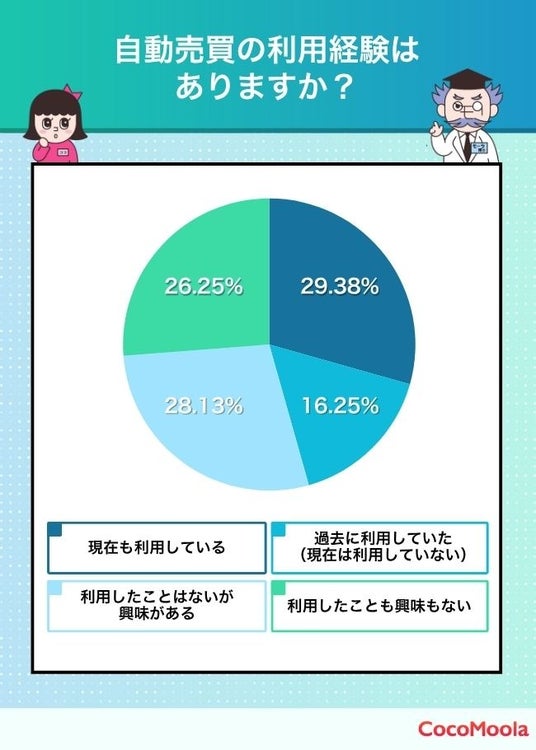 - FXの自動売買について「現在も利用している」と回答した人は30%、「興味があるが未経験」とした人は28%と、関心層は全体の6割を超える結果になった。