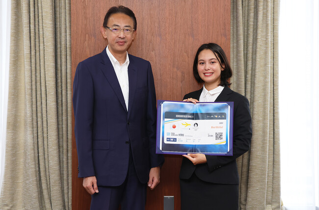 令和6年5月27日(月曜日)、高槻市出身の西田カピーリア桜良さん(関西大学総合情報学部4年生)が高槻市役所を訪問し、今夏に開催されるパリオリンピックにセーリングの混合ナクラ17級で出場することを濱田剛史市長に報告しました。