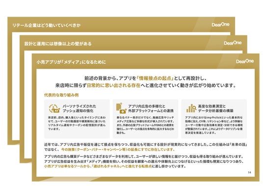 株式会社NTTドコモのマーケティング分野における新規事業型子会社である株式会社DearOne(本社:東京都港区、代表取締役:河野 恭久、以下:DearOne)は、「リテールメディア動向レポート(2025年4-6月版)」を公開しました。本レポートは、国内のリテールメディア市場の動向、特にリアル店舗を軸とした取り組みの現状と、アプリをメディア化するポイントについてまとめたものです。