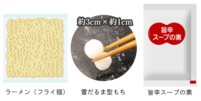 ・もち…国内製造・国産うるち米を使用した、もちもち食感の雪だるま型もちです。箸で持ちやすく、煮くずれしにくいところが特徴です。
