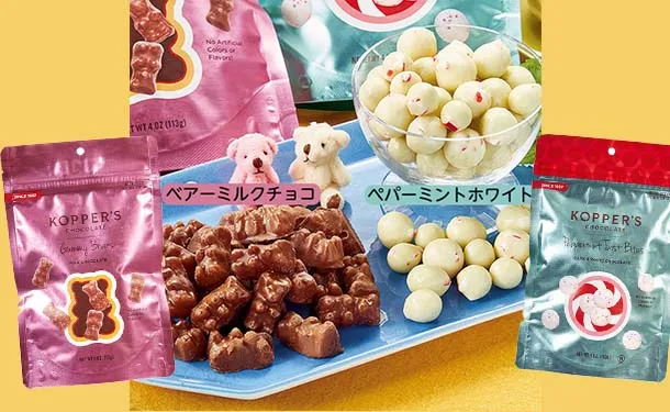 特長:中にダークチョコと砕いたペパーミントキャンディが入ったサクサク触感の「ペパーミントホワイト」と見た目がかわいらしいベアーグミ入った「ベアーミルクチョコ」の2種類。
