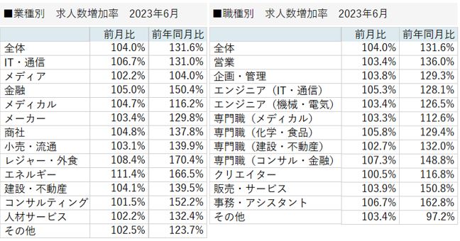 2023年6月の転職求人倍率は、前月から+0.06ポイントの2.26倍となりました。求人数は前月比104.0%、前年同月比131.6%となりました。転職希望者数は前月比101.3%、前年同月比111.3%でした。