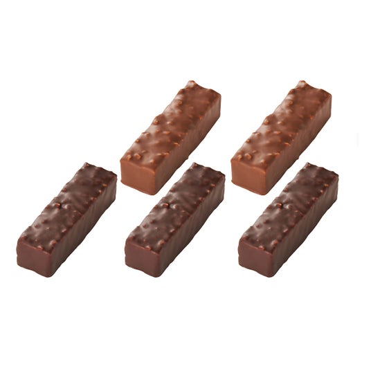 砕いたヘーゼルナッツのサブレをジャンドゥージャと合わせ、ダークとミルクそれぞれのチョコレートでコーティング。ヘーゼルナッツ尽くしのミニバーです。