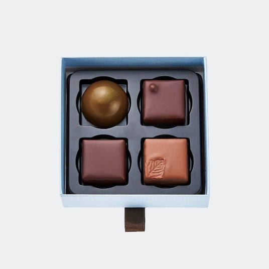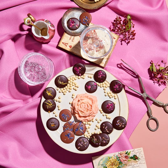 プラリネでできたバラと、産地別のカカオを使用したチョコレートの詰め合わせは、自然の素晴らしさをチョコレートで表現した華やかかつ繊細な一品です。ビターチョコレートはジャマイカ産、ペルー産、ベネズエラ産のカカオを使用。それぞれにトッピングされている花は異なり、見た目の美しさはもちろんのこと、カカオの風味を存分に楽しめます。