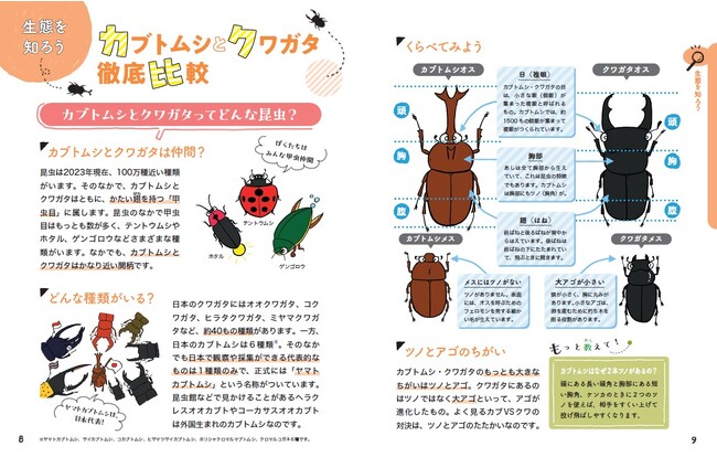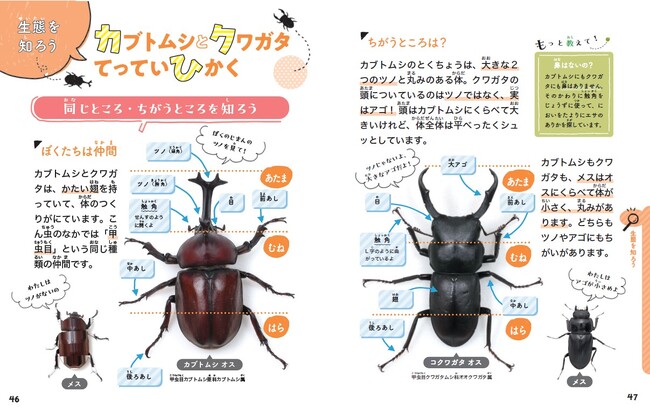 本書前半の「親パート」は、監修の昆虫芸人・堀川ランプ氏によるかわいらしいイラストで、カブトムシ・クワガタの基本知識や採集・飼育に必要な道具などを解説。こわくないつかみ方、もし死んじゃったときは…など、苦手だからこそ気になるポイントも徹底網羅。生体写真は一切ないので、写真すらこわいママパパでも安心して読めます。
