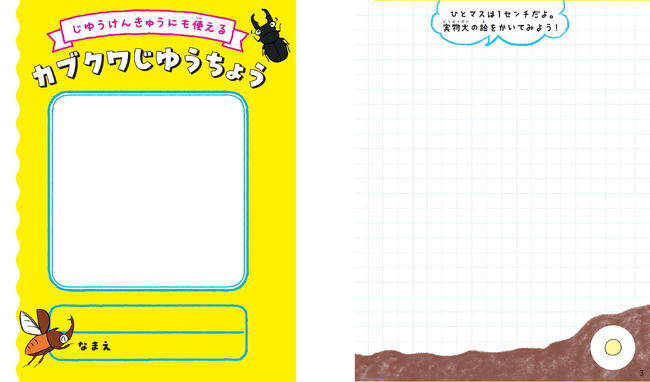 子どもが自ら「やりたい」「飼いたい」と言ったのに、すぐに飽きてしまうかも…?という心配も大いにあるでしょう。そんな時に助けてくれる、3つのアイテムを特別付録で用意しました。いずれも楽しくカブトムシ・クワガタの観察を深められるオリジナルアイテムです。自由研究にも大いに活用できます。